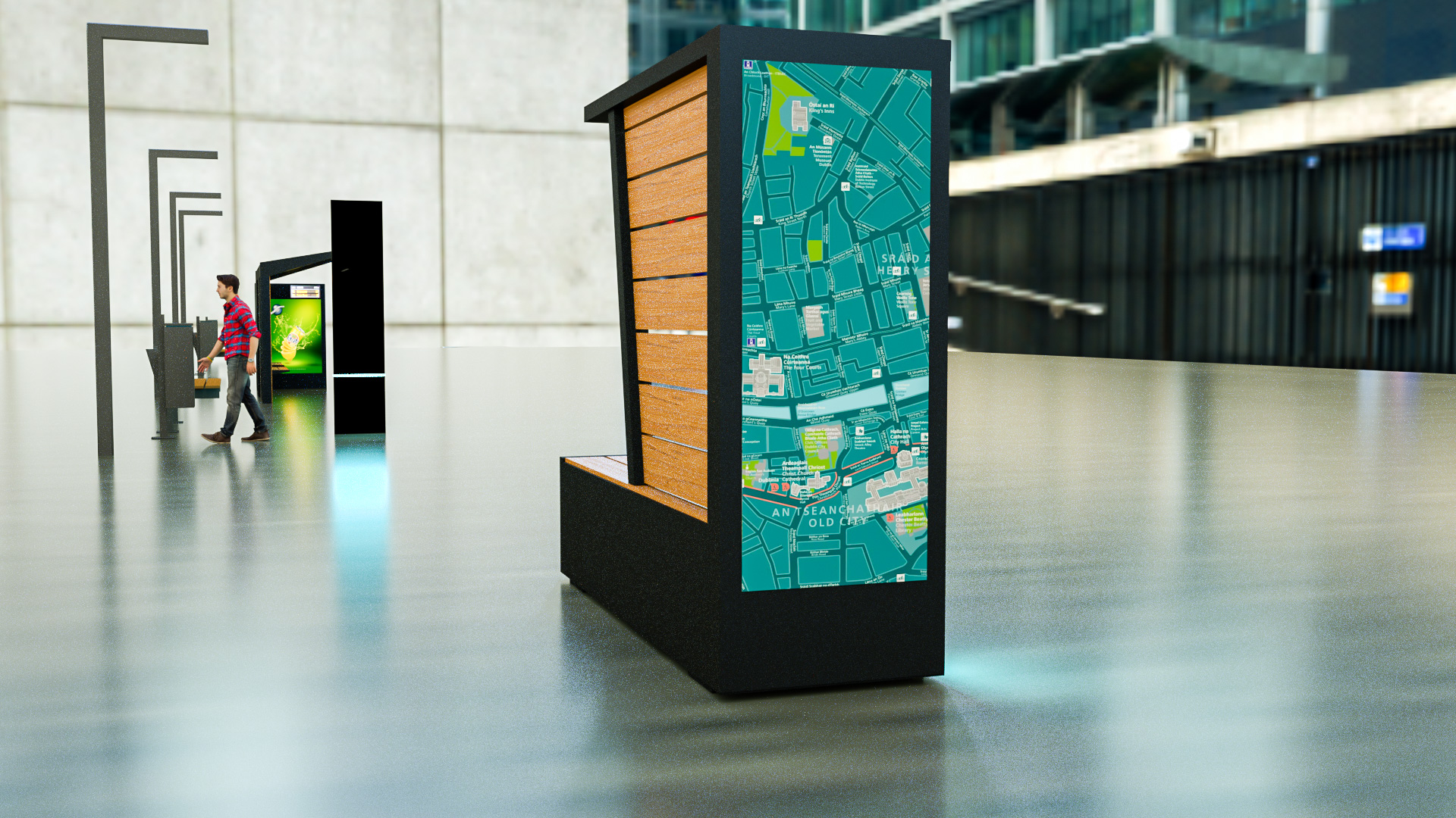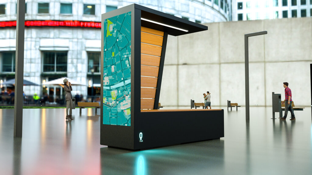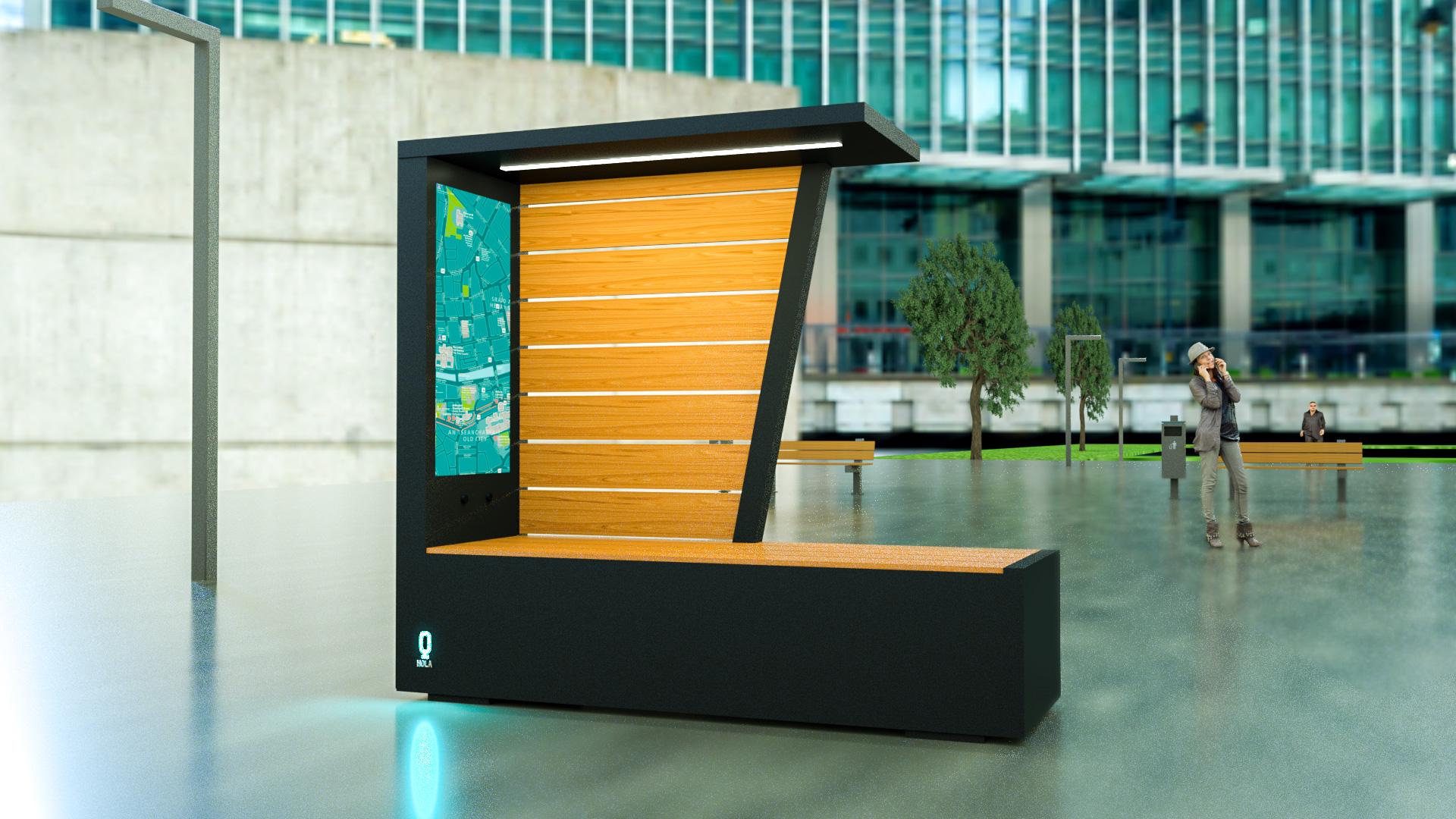 Mit den Vorteilen der Hola L Solarbank können Sie Ihr Handy, Ihre Kamera oder drahtlose Kopfhörer aufladen. Durch das Scannen des QR-Codes auf der Bank können Benutzer Informationen über erneuerbare Energiequellen erhalten. Auf beiden Seiten des Pfostens befindet sich eine Stadtkarte, die den Besuchern zusätzliche Informationen zum Standort bietet.
